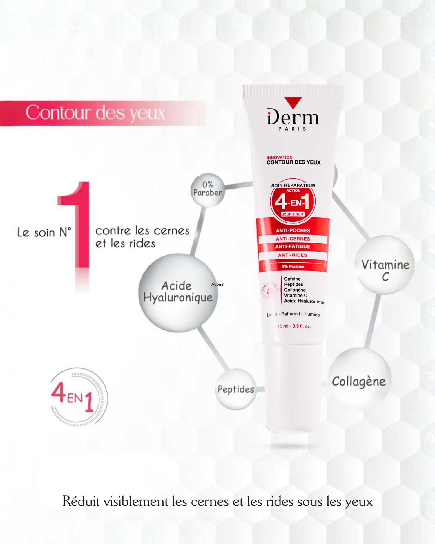 Une action complète ciblant cernes, poches, rides et signes de fatigue pour un regard plus lisse et éclatant